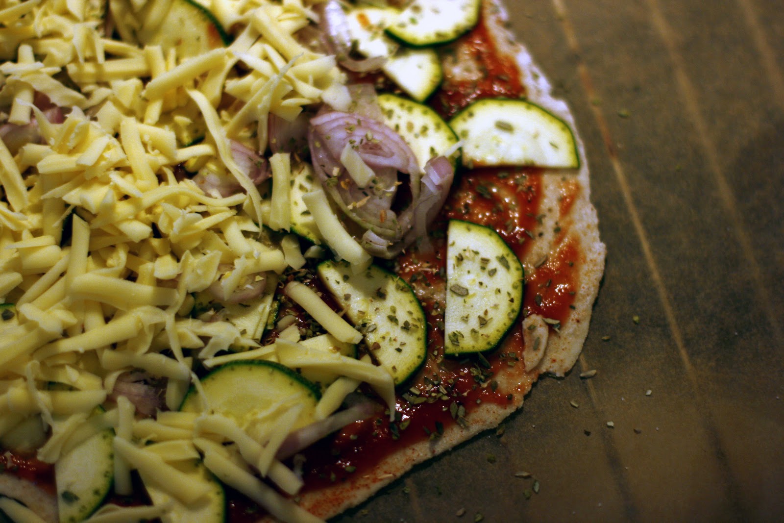 Für die Zucchini-Zwiebel-Pizza den ausgerollten Teigfladen mit Tomatensauce bestreichen, die Zucchini-Scheiben und die Schalottenringe darauf verteilen, mit Salz und Pfeffer würzen und wenn gewünscht, zuletzt mit dem geriebenen Gouda bestreuen.