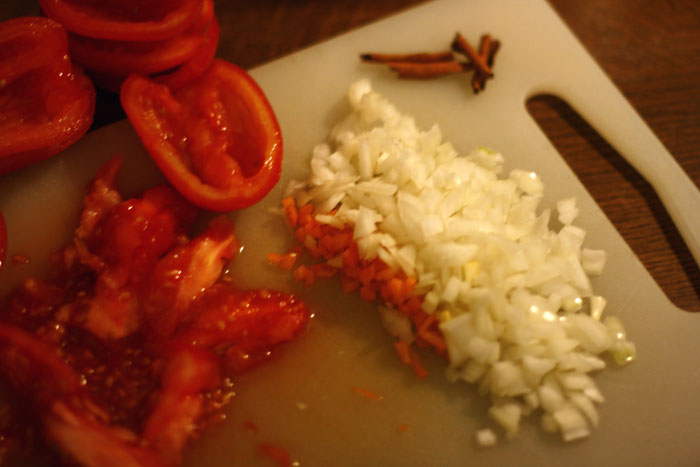 Zwiebeln und Chili fein hacken, Ingwer putzen und reiben. Tomaten klein schneiden und Inneres entfernen, dann fein hacken.