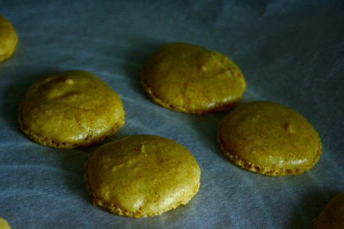 Teig in einen Spritzbeutel füllen. Ein Backblech mit Backpapier auslegen, den Ofen auf 150 °C Umluft vorheizen und mit Hilfe des Spritzbeutels 20 gleich große Teigklekse auf das Blech platzieren (nicht zu nah beieinander!). Nun die Macarons ca. 15 Minuten lang ruhen lassen. Jetzt den Ofen auf 140 °C runterschalten und die Macarons auf der mittleren Schiene in den Backofen schieben. Nach ca. 12 – 15 Minuten aus dem Ofen holen (jeder Ofen ist anders, ausprobieren…).