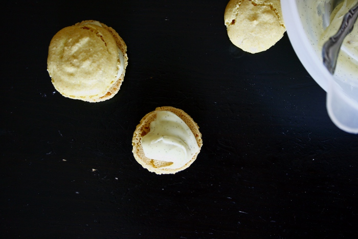 Beiseite stellen und die Ganache vorbereiten: Vanilleschote halbieren und das Mark herauskratzen. Sahne erhitzen. Weiße Schokolade hacken und im Wasserbad schmelzen, dann die warme Sahne und die Vanille einrühren. Abkühlen lassen, dann für 1 – 2 Stunden in den Kühlschrank stellen. Die Macarons anschließend mit der Ganache füllen und im Kühlschrank aufbewahren.