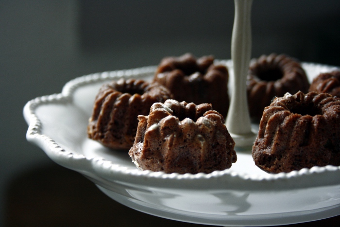 Butter und Ei gut verquirlen. Dann den Puderzucker hineinsieben und weiterrühren, bis sich eine homogene Masse bildet. Jetzt das Backpulver, Salz, Kakaopulver und Mehl hinzusieben und wenn der Teig zu fest ist, noch einen Schuss Milch! Da Eier oft unterschiedlich groß sind und man bei so geringen Mengen dann gleich mehr oder weniger Flüssigkeit hat, müsst ihr einfach selbst entscheiden ob noch ein bisschen Milch dazu muss oder nicht. Der Teig sollte matschig-fest sein, kein flüssiger Pfannkuchenteig.Ofen auf 200° C vorheizen. Nun die Marzipan-Schokoladenriegel in kleine Stücke hacken und in den Teig rühren. Wer möchte, kann auch gehackte Mandeln dazugeben. Nun die Silikonförmchen ausbuttern und mit Mehl bestäuben. Überschüssiges Mehl abklopfen. Mit Hilfe von zwei Teelöffeln nun die Schokomasse in die Förmchen geben, dabei aber aufpassen, dass die Förmchen nur zu 2/3 voll sind. Die Gugl gehen noch auf und werden sonst schief. Die Silikonform für etwa 12 – 13 Minuten in den Ofen schieben.
