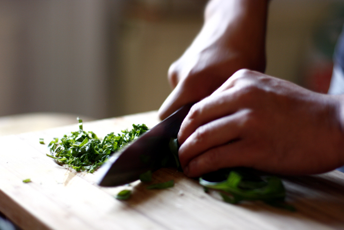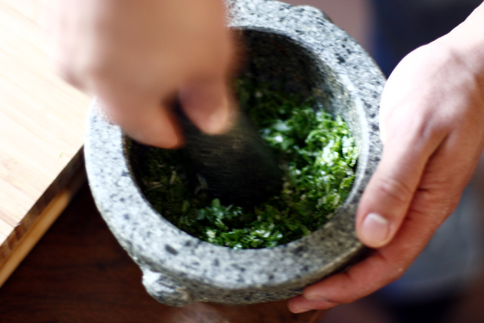 Knoblauch fein hacken, dann mit etwas Salz im Mörser zerstossen bis es eine Paste gibt. Den fein gehackten Rucola dazugeben.