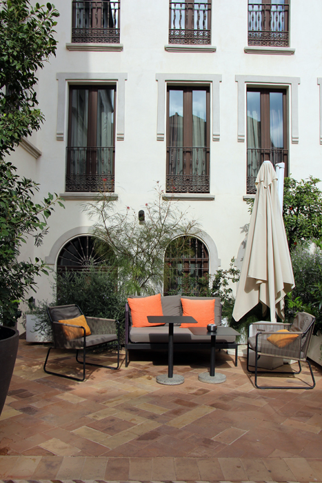 Wenn man das Hotel über die Marmortreppe betritt, steht man in einem luftigen Innenbereich, der wirklich aussieht wie ein Palast! Er ist das Zentrum des Hauses – von dort erreicht man die Zimmer, das Restaurant und den Frühstücksbereich sowie einen gemütlichen Innenhof mit den in Sevilla allgegenwärtigen Orangenbäumen.