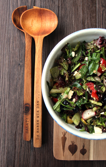 Wer auf der Suche nach einem schönen Salatbesteck ist, sollte sich mal bei Räder* umgucken. Dort gibt es nämlich das Holzbesteck mit dem lustigen Spruch “Da haben wir den Salat!” zu kaufen sowie das Brotzeitbrettchen mit Wurzelgemüse. Beides neue Lieblingsteile in meiner Küche, die ich gern und oft verwende. Die Qualität stimmt bei Räder einfach und das Design ist absolut einzigartig. Ehrlich gesagt könnte ich mich da wirklich arm kaufen, denn mir gefällt ungefähr jedes Teil total gut. Wer auf der Suche nach Geburtstagsgeschenken für FreundInnen oder Eltern ist, wird dort sicherlich auch schnell fündig.
