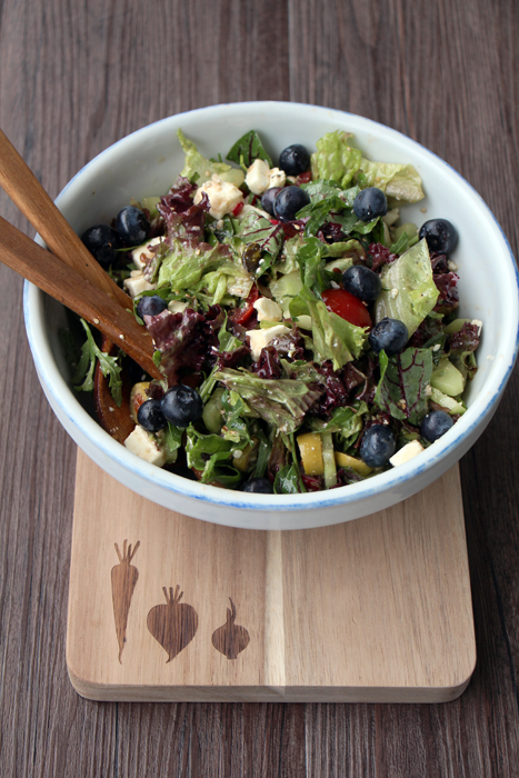 Sommerzeit ist Salatzeit! Was gibt es besseres als abends auf dem Balkon Brotzeit zu machen mit einer großen Schüssel Salat? Bei uns gibt es mindestens zwei- bis dreimal pro Woche welchen, meistens verblogge ich ihn allerdings nicht. Zu unspektakulär, dachte ich. Bis ich Blaubeeren in den Salat geschmissen habe und dachte “Das musst du teilen!” – schmeckt nämlich total herrlich! Die Kombination mit dem salzigen Feta und den Tomaten ist einfach großartig.