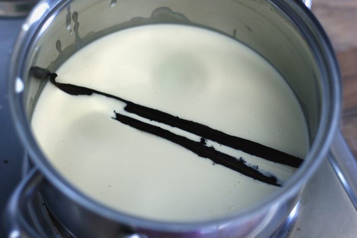 Milch und Sahne in einem Topf aufkochen lassen. Vanilleschote aufschneiden und das Mark herauskratzen.