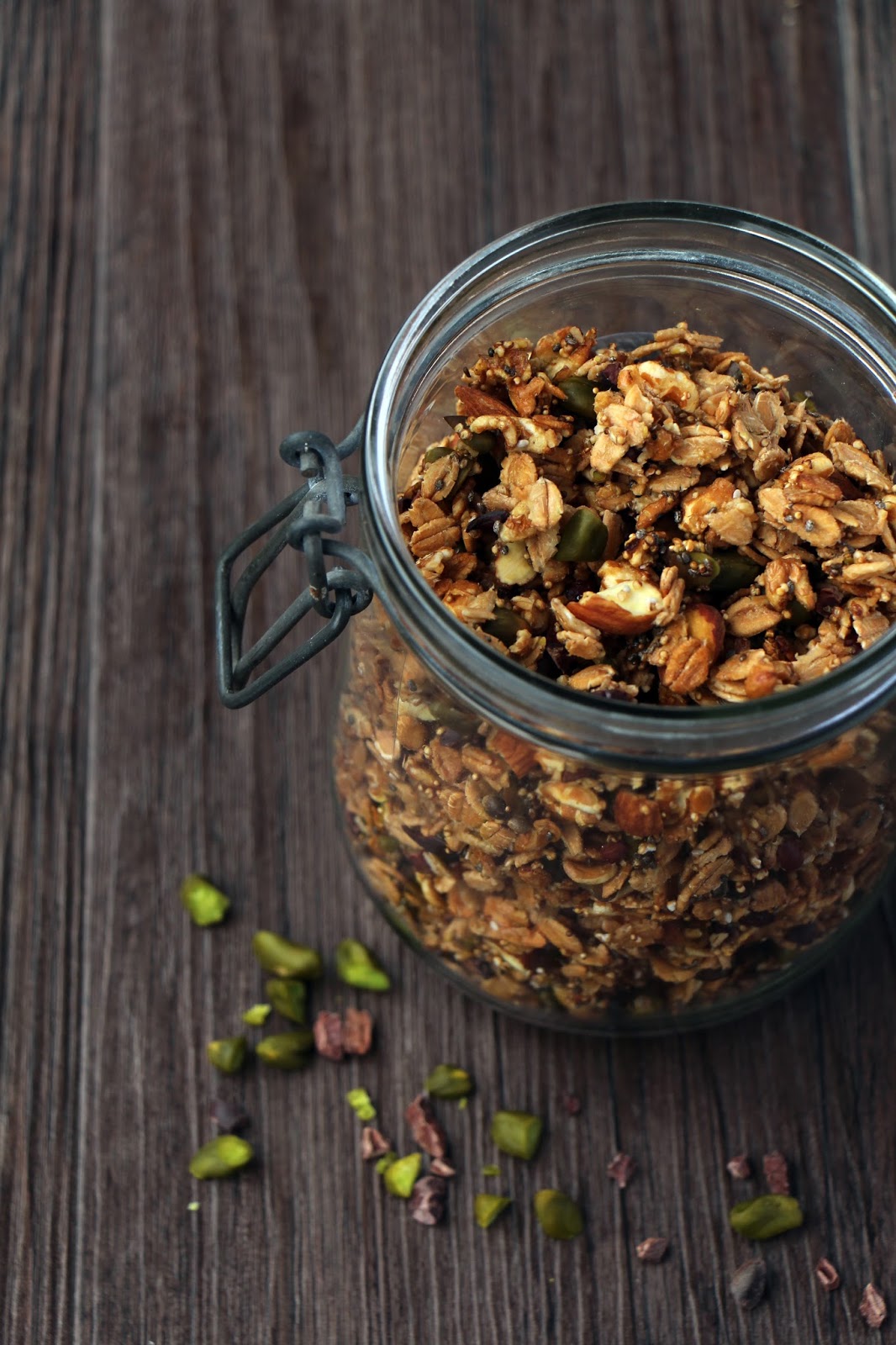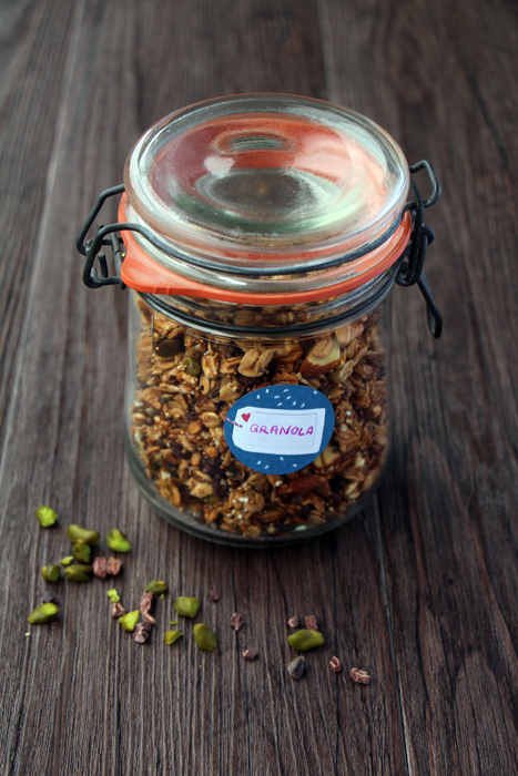 Um das köstliche Granola mit Nüssen, Kakanibs und Amaranth herzustellen, braucht ihr nur wenig Zeit. In einem hübschen Glas eignet sich das Granola auch als Geschenk oder Mitbringsel zu einem Frühstücksbrunch. Ich habe das Müsli in ein Schnappdeckelglas gefüllt. So bleibt es schön knusprig!