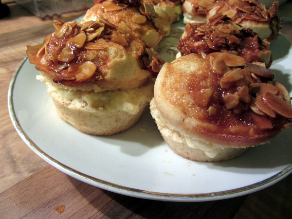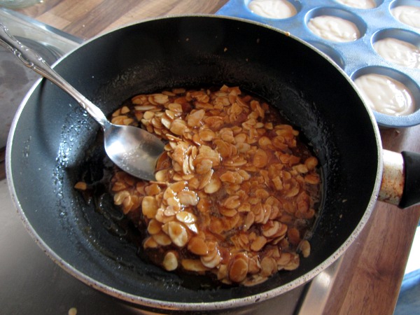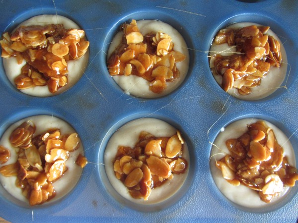 Vom Herd ziehen und kurz abkühlen lassen, dann auf den Teig in den Silikonförmchen geben (nicht zu viel Zeit lassen, sonst wird das Krokant starr und lässt sich nicht mehr verteilen).