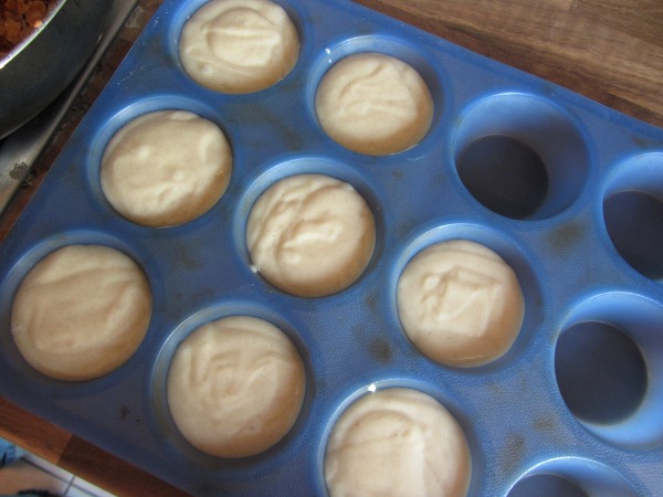 Zucker, Öl und Wasser verrühren. Mehl und Backpulver dazugeben, zu einem glatten Teig verrühren, dann den Zimt hinzugeben. Den Teig in 8 Silikonförmchen füllen.