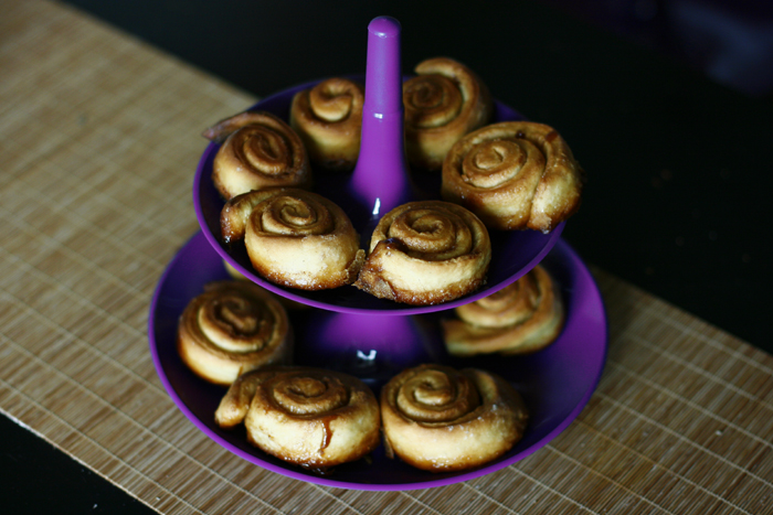 Die Étagère ist von Koziol und heisst Babell! Praktischerweise kann man sie platzsparend auseinandernehmen und ineinander stecken – oder verkleinern, indem man nur zwei Etagen nimmt statt drei. Da sie aus Plastik ist lässt sie sich auch einfach reinigen. Das Lila passt prima zu den Zimtschnecken, finde ich!
