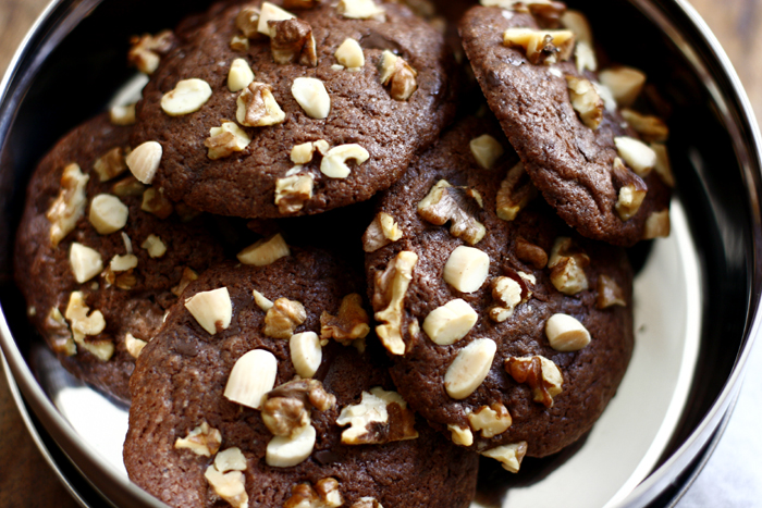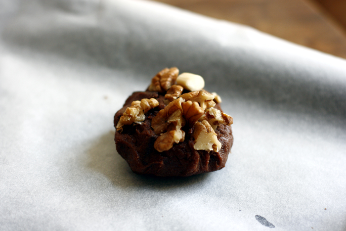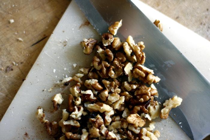 Backofen auf 170 Grad vorheizen. Ich habe jetzt den Teig kurz ins Tiefkühlfach gestellt, dann lassen sich die Cookies später einfacher formen. In der Zwischenzeit habe ich die Nüsse gehackt.
