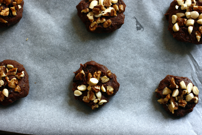 Man nimmt einen großzügigen Esslöffel voll Teig, formt eine Kugel, drückt sie etwas flach und lässt ihn in die gehackten Nüsse fallen. Dann mit der Nussseite nach oben auf ein Blech mit Backpapier setzen.